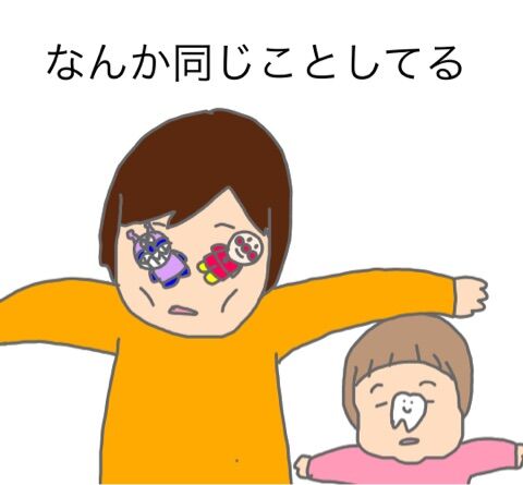 アンパンマンのおもちゃを目に乗せて寝転がっていたら、隣で歯のおもちゃを顔に乗せて寝ていた。